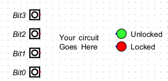 Your lock should have four different inputs representing a four bit binary number, and two ouptut leds, one lit when the lock is "unlocked" or has one of the three correct codes, and one that is lit when the lock is not unlocked.