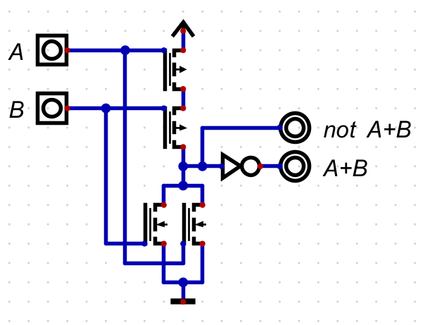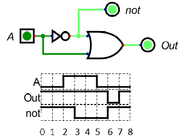 - At the same time, the not was producing a low and A was low so the or gate produces a low for a "time step"