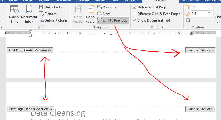 - Notice the Link to Previous toggle in the Tab and the Same as Previous alert in the heading/footer.