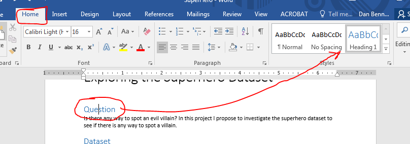 Clicking on a heading indicates Heading 1 in the style section of the home tab.