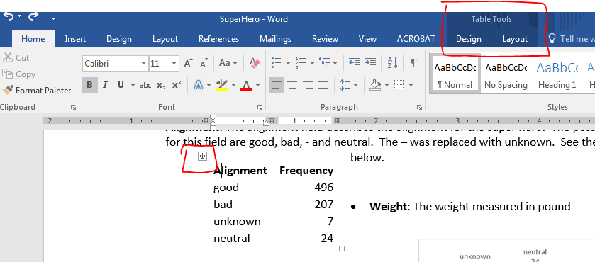Adjust the table using the Layout tab
