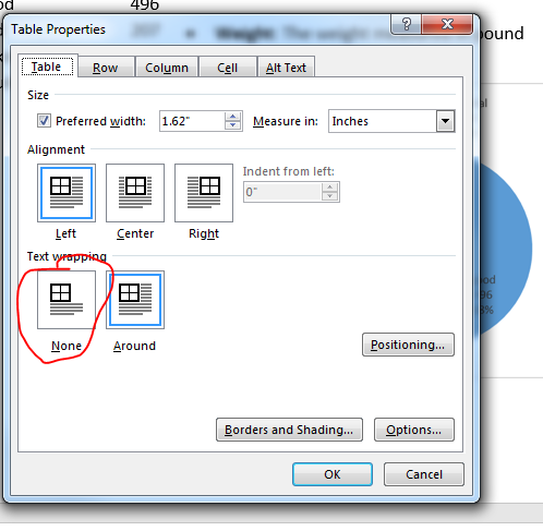 Selecting None for Text wrapping allows us to position the table next to the picture.