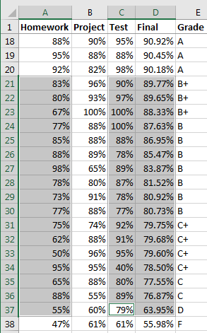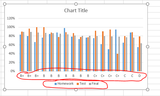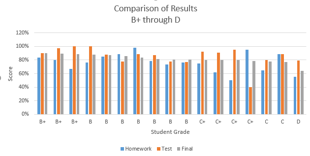 - I want to build a column chart displaying Homework, Test and Final for the grades between A and F.