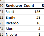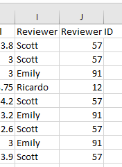 - Use the table you just constructed to Add a Reviewer ID field which contains the Reviewer ID corresponding to the Reviewer in column I.