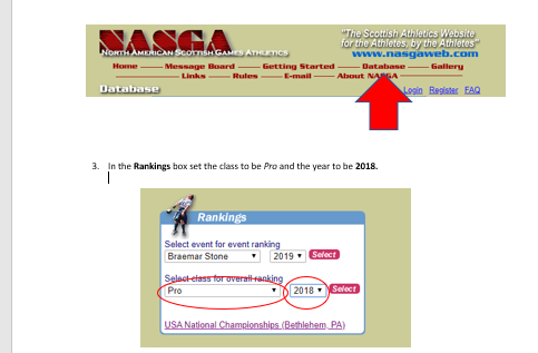For this project we will be using the Overall rankings for the North American Scottish Games Athletics (NASGA) in 2018. This data is from NASGA's web page located here. A modified workbook containing the data is located here.
