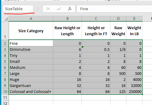 - Put SizeTable in the Name Box