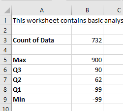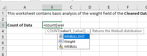 - Add a comment in cell a1 that states "This worksheet contains basic analysis of the weight field of the Cleaned Data worksheet.