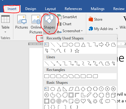 - On the Insert tab, Illustrations command group select the Shapes Dropdown.