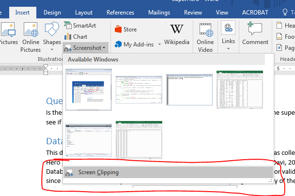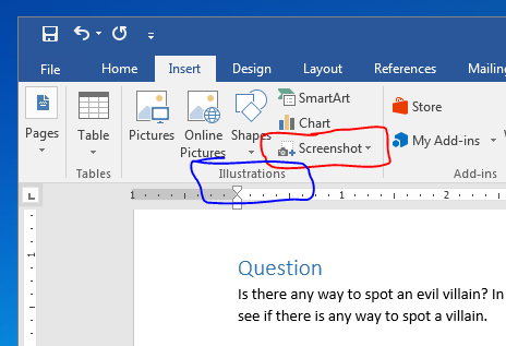 - Select the ScreenShot dialog box launcher in the Illustrations command group.