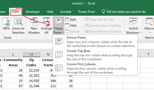 - On the View tab in the Window command group dropdown the Freeze Panes menu.