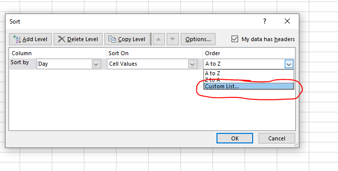 - Drop the Order list down and select Custom List