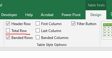 - Click on the Total Row checkbox in the Table Style Options command group of this tab.