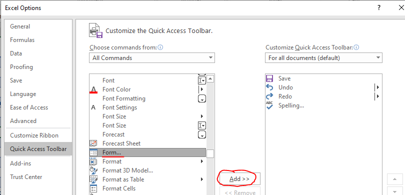 Add the form tool to the quick access area