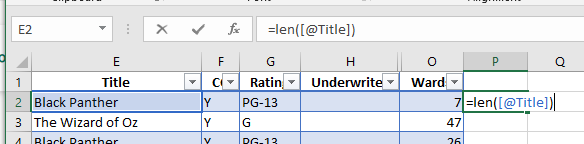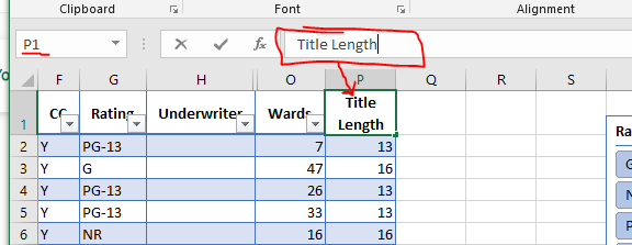 - Change the title in cell P1 to be Title Length