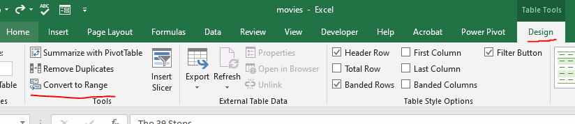 - On the Table Tools Design tab, select Convert To Range in the Tools command group.
