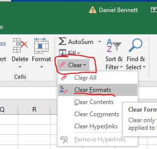 - On the Home Tab in the Editing command group drop down the Clear menu and select Clear Formats
