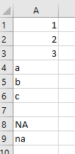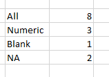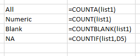 - Add a cell called NA, then =countif(list1, "na"), or better yet, reference the cell.
