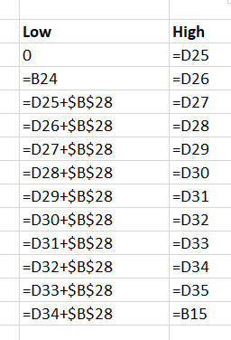 - Label Two columns "Low" and "High" (D23 and E23)