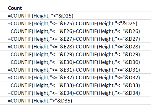 - In G25 put =countif(height, "<=" & D26) - countif(height, "<" & D25)