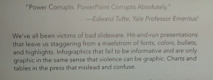 - "We've all been victims of bad slideware. Hit-and-run presentations that leave us staggering from a maelstrom of fonts, colors, bullets, and highlights. Infographics that fail to be informative and are only graphic in the same sense that violence can be graphic. Charts and tables in the press that mislead and confuse."