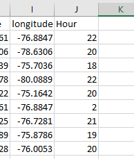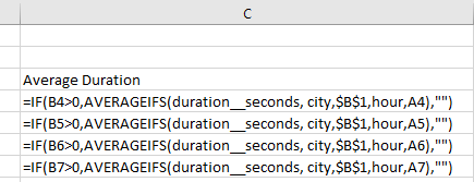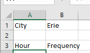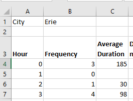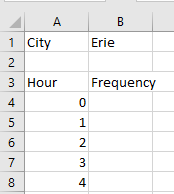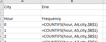 - Use a countifs function to compute the frequency for the given city for each hour.