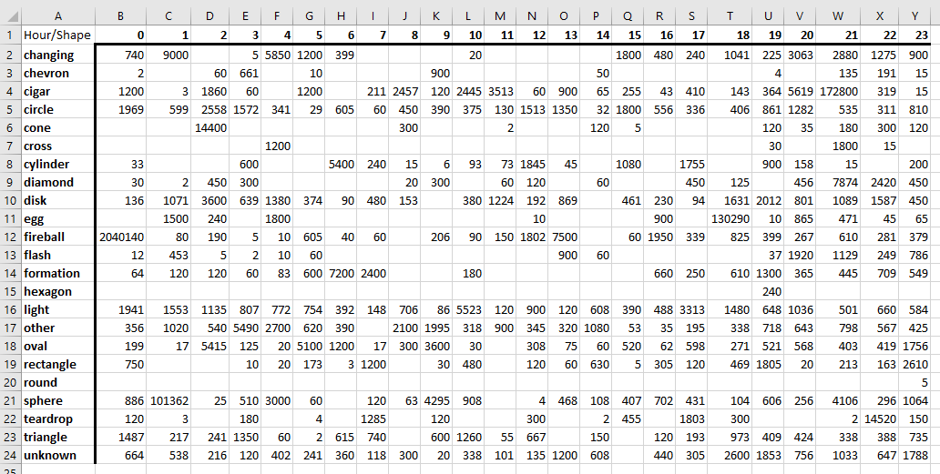 - In the cell, the average duration (in seconds) for that shape at that hour.