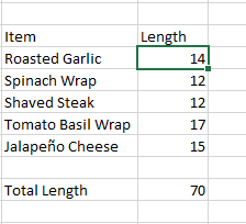 - In a cell enter =sum(len(c9:c13)) with crtl-shift-enter